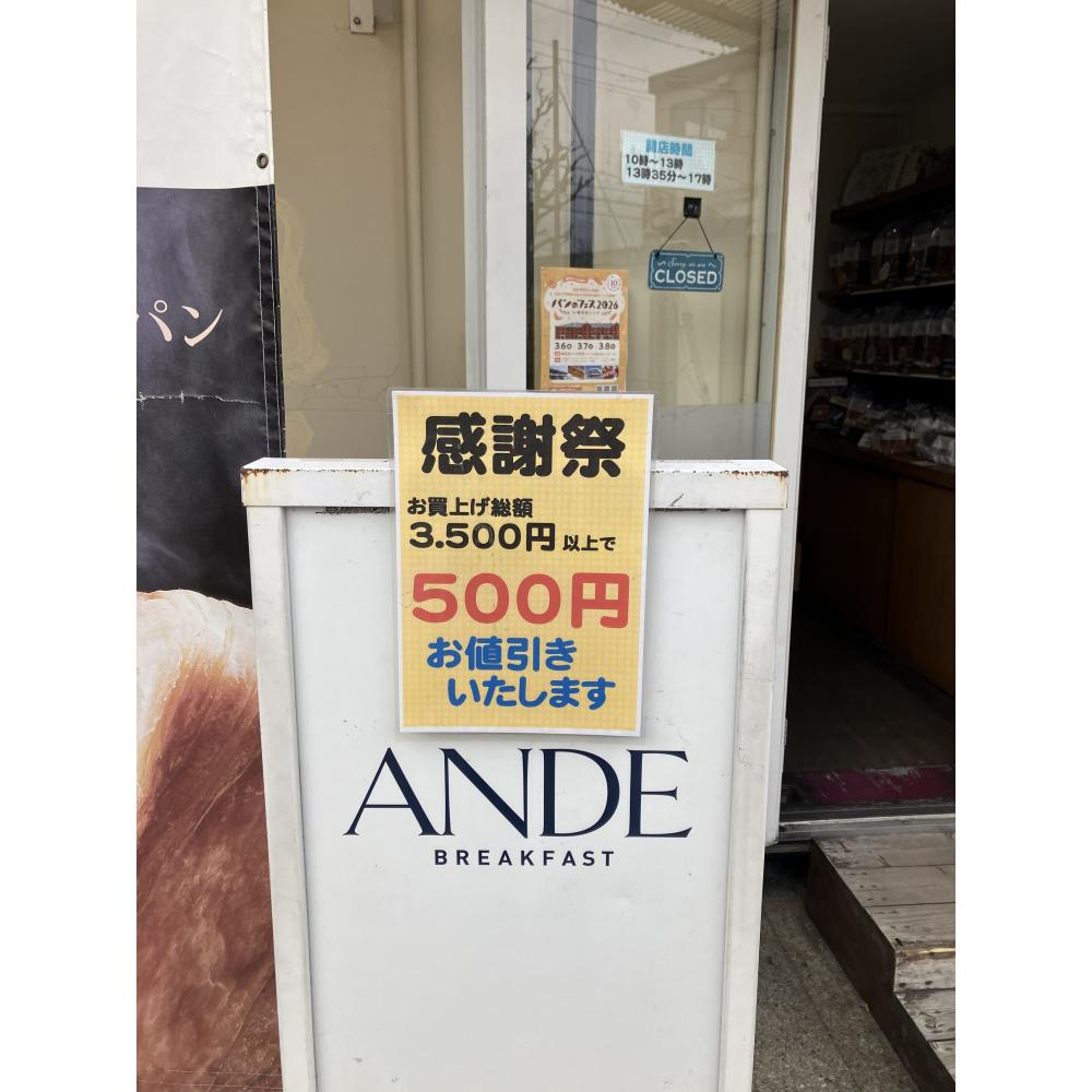 デニッシュ食パン専門店アンデの京都工場直売所では、毎月第4土曜に「感謝祭」を開催しております。